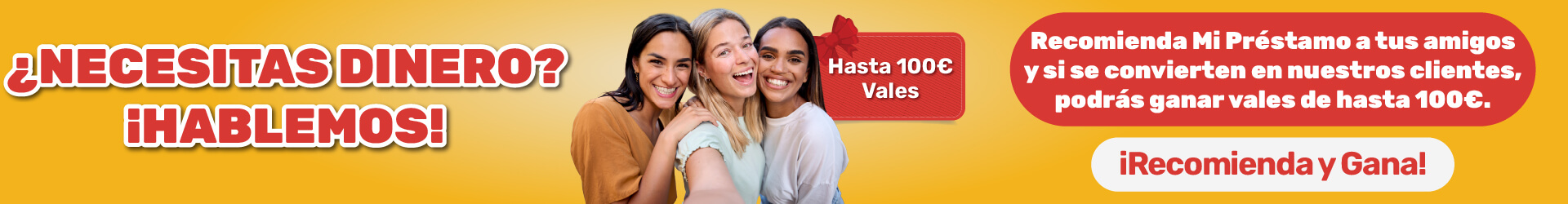Recomienda Mi Préstamo a tus amigos y si se convierten en nuestros clientes, podrás ganar vales de hasta 100 euros.